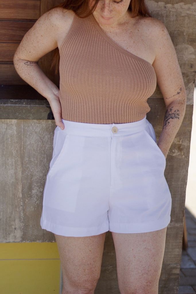 O short curto é feito em um tecido de viscose levemente estruturada e encorpada. Com estilo alfaiataria, possui cintura alta e comprimento curto. A modelagem é levemente alargada, com elástico na parte das costas e fechamento com botão de madeira e zíper na parte da frente. O acabamento é feito em costura francesa e conta com bolsos laterais que deixam essa peça ainda mais prática. Encontre seu tamanho usando o provador virtual